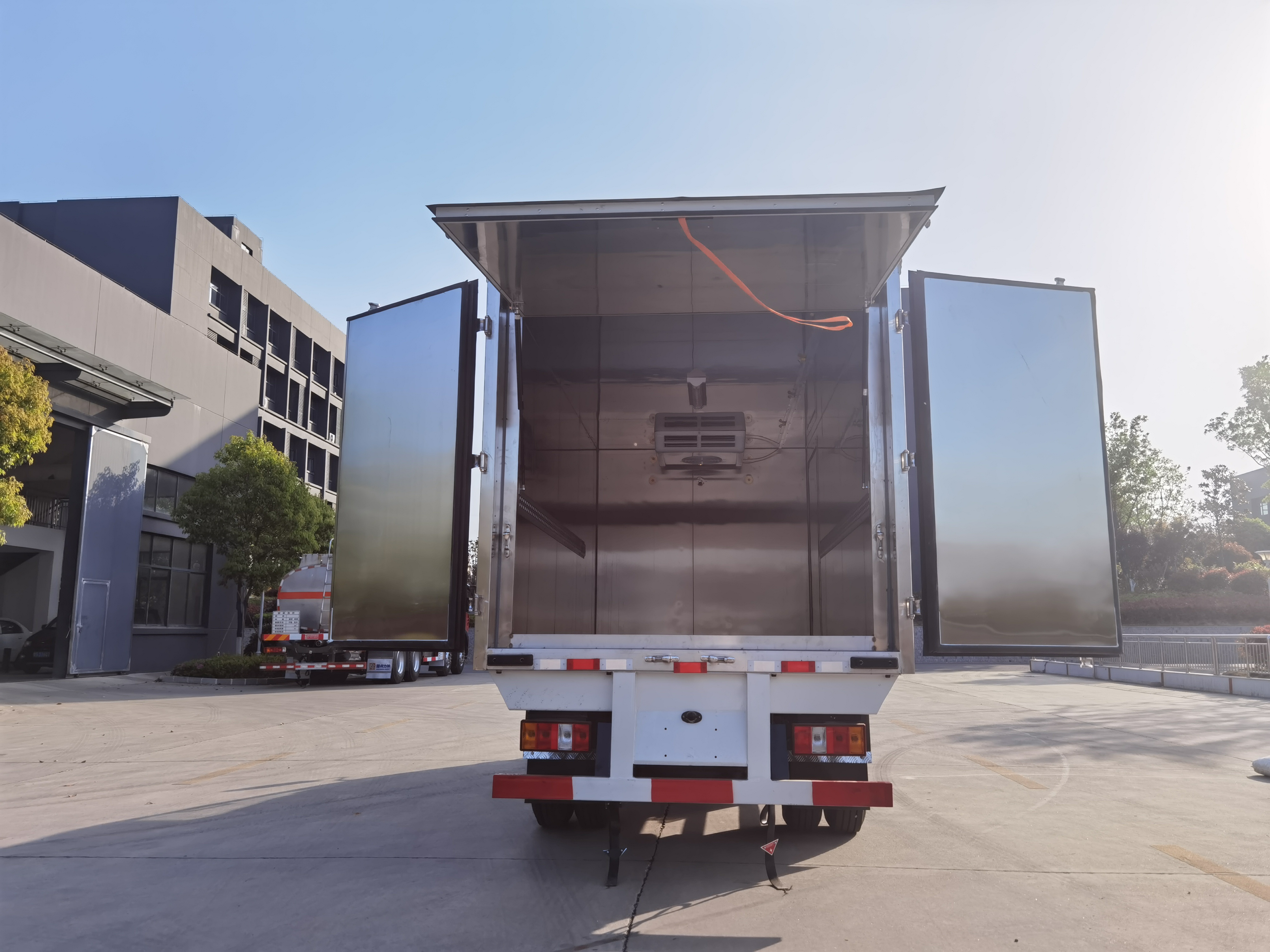 【改装要求】:厢体配置:厢体采用内不锈钢外玻璃钢板制作,中间6厘米厚保温板,铝合金型材包边,门框、门锁件及合页为不锈钢,内装自喷雾装置和紫外线灭菌灯,厢内两侧加装固定货物的防撞板,厢体右前侧选开单侧门,加装废液收集罐,安装-5度制冷机组。