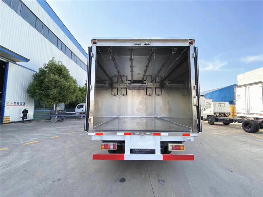 肉勾冷藏车在生产过程中,厢体必须加固,可根据客户的要求加装3条,4条,5条滑道。