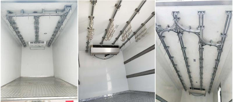 肉勾冷藏车在生产过程中,厢体必须加固,可根据客户的要求加装3条,4条,5条滑道。